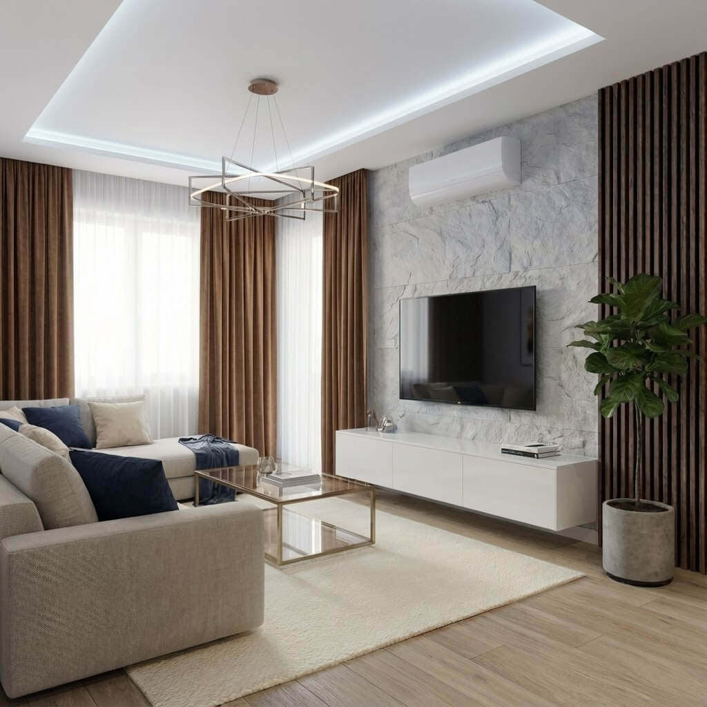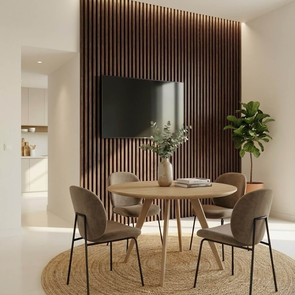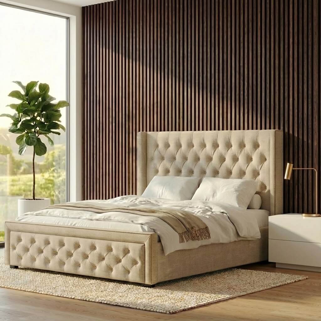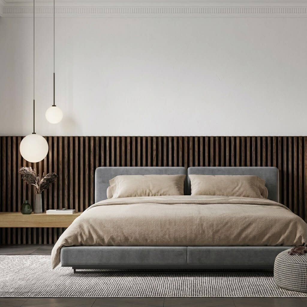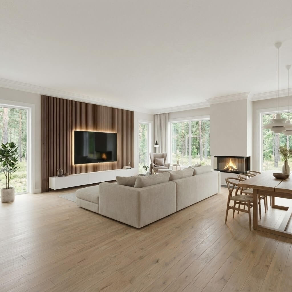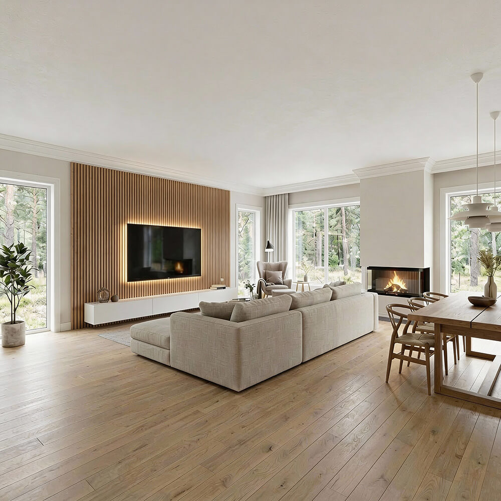 Nasz Lamel Orzech Złoty został dostosowany do wymogów współczesnej architektury. Jego wymiar pozwala na montaż na pełnej wysokości ściany – od podłogi aż po sufit – bez widocznych styków. Pozwala to uzyskać efekt jednolitej, strzelistej płaszczyzny, która optycznie powiększa przestrzeń i nadaje jej ekskluzywny charakter.