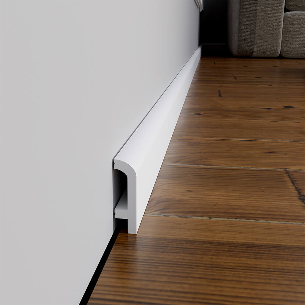 Zaletą niskiej listwy LCL-05 jest jej uniwersalność – świetnie prezentuje się zarówno w mniejszych mieszkaniach, gdzie wyższe listwy mogłyby zaburzyć proporcje, jak i w nowoczesnych, przestronnych aranżacjach, gdzie pełni rolę delikatnego, estetycznego wykończenia.